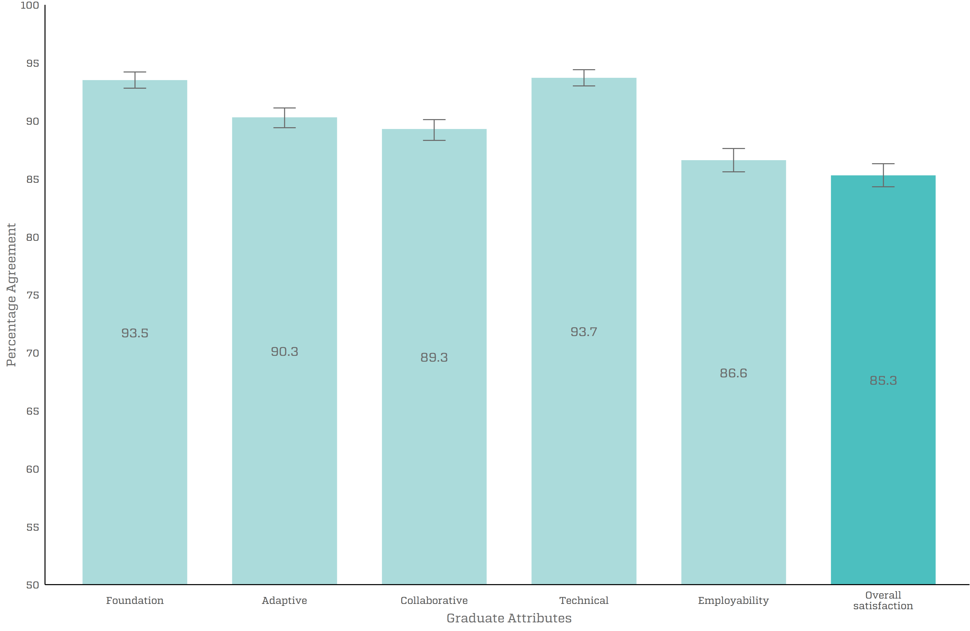 In 2021 the supervisor response rate was 44.0 per cent with over 3,450 supervisor responses. The 2021 ESS results are large enough to provide robust comparisons by broad field of education, course characteristics, employment characteristics, occupation and demographic group. There are sufficient results from the 2019, 2020 and 2021 ESS combined to provide comparisons across universities. With the overall satisfaction of graduates rated by direct supervisors at 85.3 per cent, the results of the 2021 ESS affirms the value of higher education qualifications for employment. Below is a summary of the survey outcomes. The 90 per cent confidence intervals are presented to aid in interpretation of the data. Please refer to the 2021 ESS National Report for detailed ESS results.