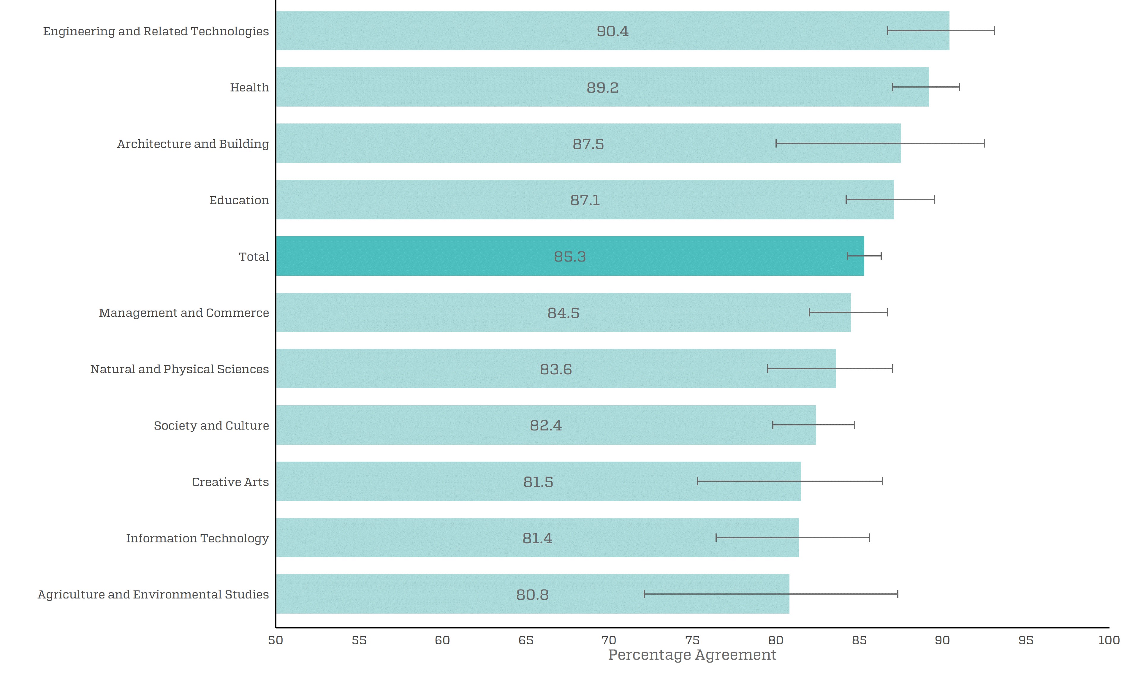 In 2021, employers reported highest overall satisfaction with engineering and related technologies graduates at 90 per cent. Supervisors also reported above average satisfaction with health graduates, 89 per cent, architecture and building graduates, 88 per cent, and education graduates, 87 per cent. On the other hand employer satisfaction, while still high, appears lower for agriculture and environmental studies graduates and information technology graduates, both at 81 per cent, and creative arts graduates, 82 per cent.