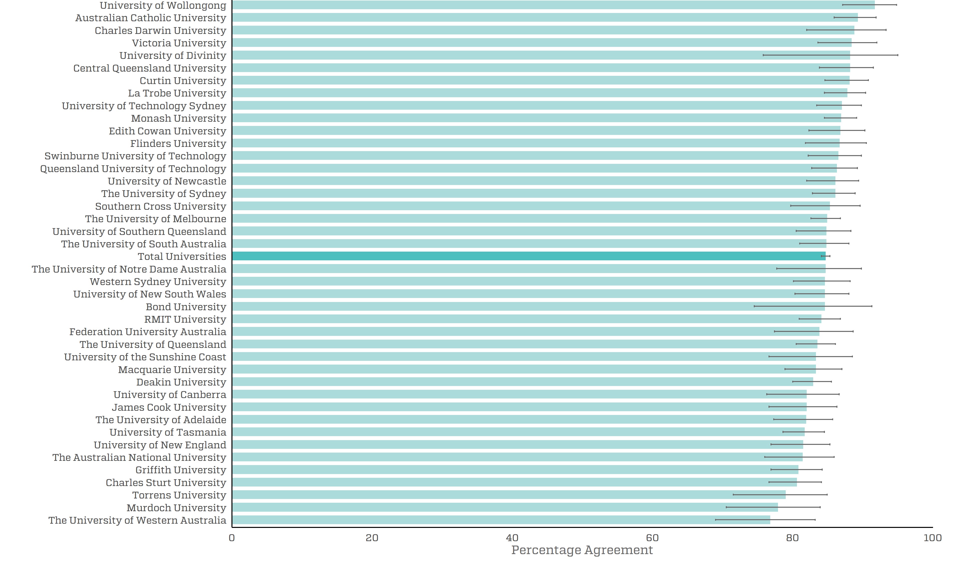Employer satisfaction is consistently high across Australia’s Table A and B universities, with overall satisfaction ranging from 77 per cent to 92 per cent across universities, when results are combined from the 2019, 2020 and 2021 surveys. Employers rated graduates from University of Wollongong the highest at 92 per cent, followed by Australian Catholic University and Charles Darwin University, both 89 per cent.